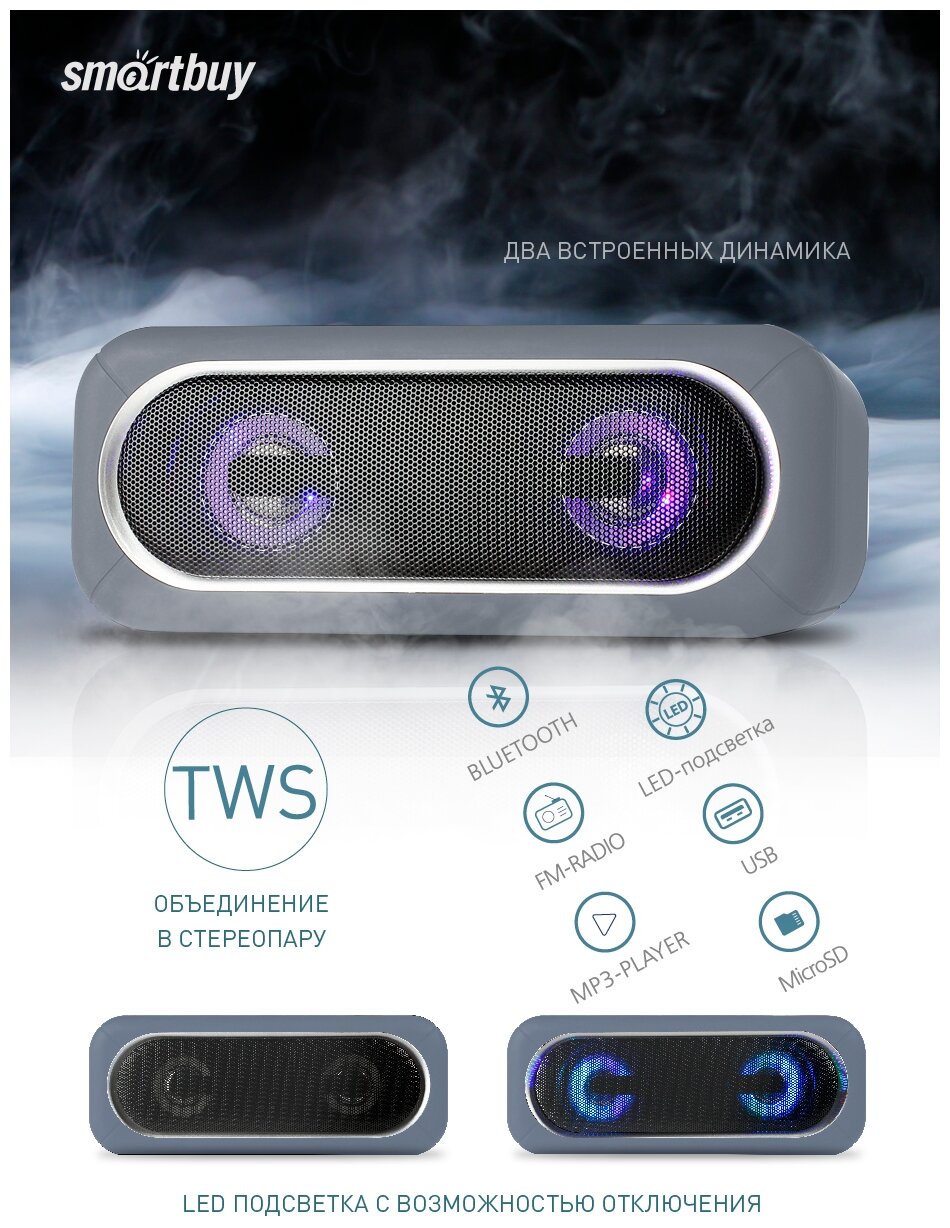 Купить Акустическая система Smartbuy SATELLITE 2 10Вт, Bluetooth, FM, MP3, LED-подсветка, серая(SBS-460)/20