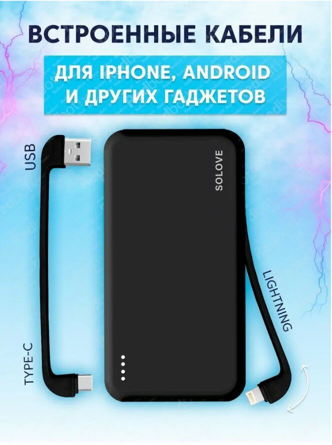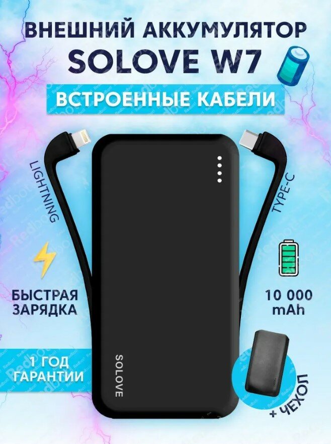 Ниже Вы можете прочитать отзывы на Внешний аккумулятор Solove Power Bank 10000mAh Dual USB/Type-C со встроенными двумя кабелями USB/Type-C и Lightning (W7 Back), черный, ознакомится с подробными характеристиками, посмотреть интересные обзоры и фотографии на Внешний аккумулятор Solove Power Bank 10000mAh Dual USB/Type-C со встроенными двумя кабелями USB/Type-C и Lightning (W7 Back), черный.