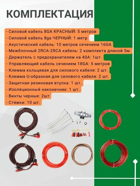 | Комплектация | силовой кабель КСнетМТ8 красный: 5 м сечением 8 GA (8,36 мм²); силовой кабель КСнетМТ8 черный: 1 м сечением 8 GA (8,36 мм²); акустический кабель КАнетМТ16 10 м сечением 16GA (2х1,32 мм²); межблочный 2RCAнет2RCA кабель КМ 2RCAнетМТ5М: 2 комплекта длиной 5 м (прямыеестьугловые RCAнетразъемы); 1 держатель с компрессионными зажимами с предохранителем типа MiniANL на 40А; управляющий кабель сечением 18GA (0,82 мм²): 5 м; 2 клеммы кольцевых для силового кабеля сечением 8 GA (8,36 мм²); 2 клеммы Uнетобразных для силового кабеля сечением 8 GA (8,36 мм²); 5 клемм Uнетобразных для акустического кабеля сечением 16GA (2х1,32 мм²); 1 защитная резиновая втулка для протяжки силового кабеля в салон автомобиля; 1 изоляционный наконечник для управляющего кабеля; 2 винта черных; 10 хомутов зажимных |