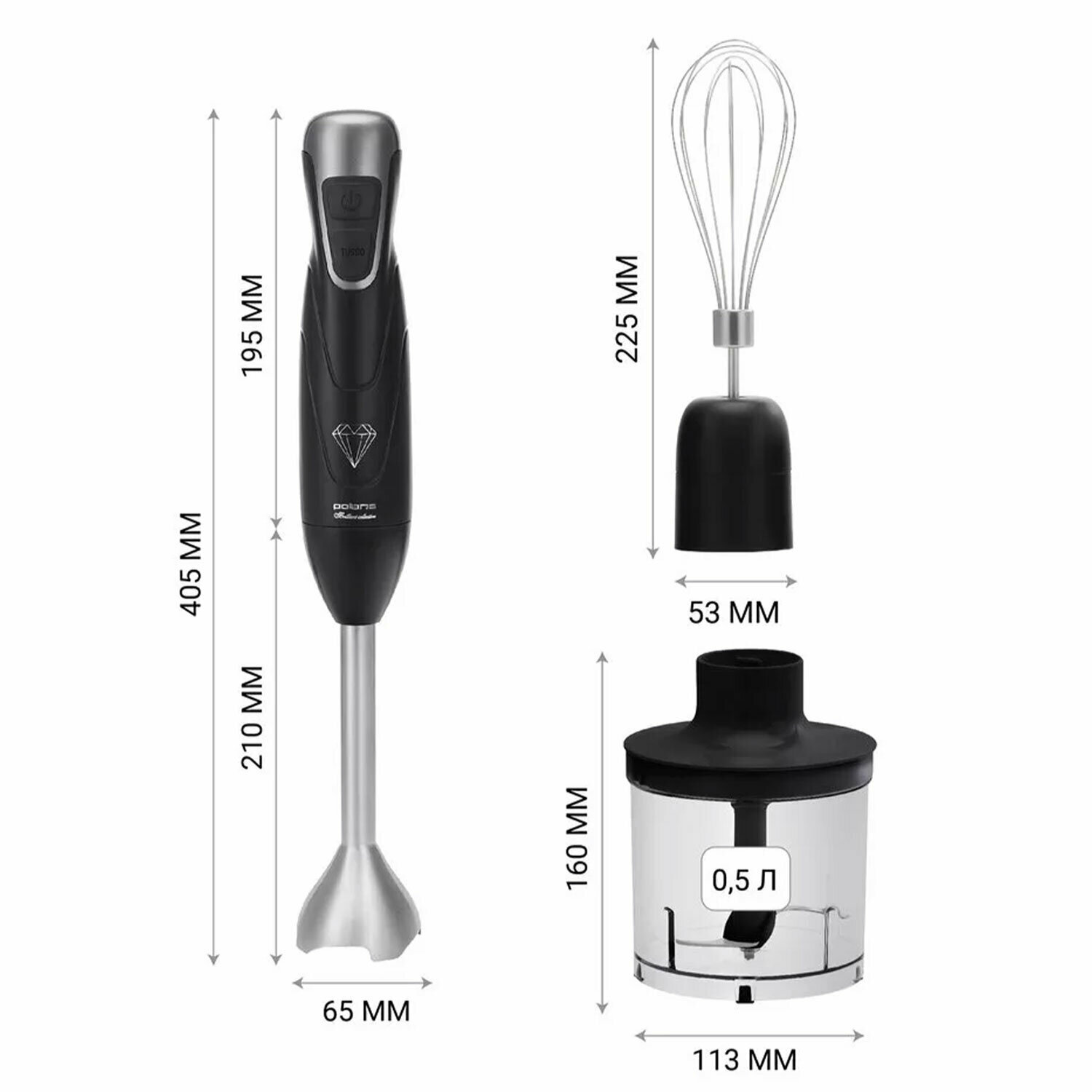Блендер погружной POLARIS PHB 0848, 800Вт, 2 режима, измельчитель, венчик, стакан, черный