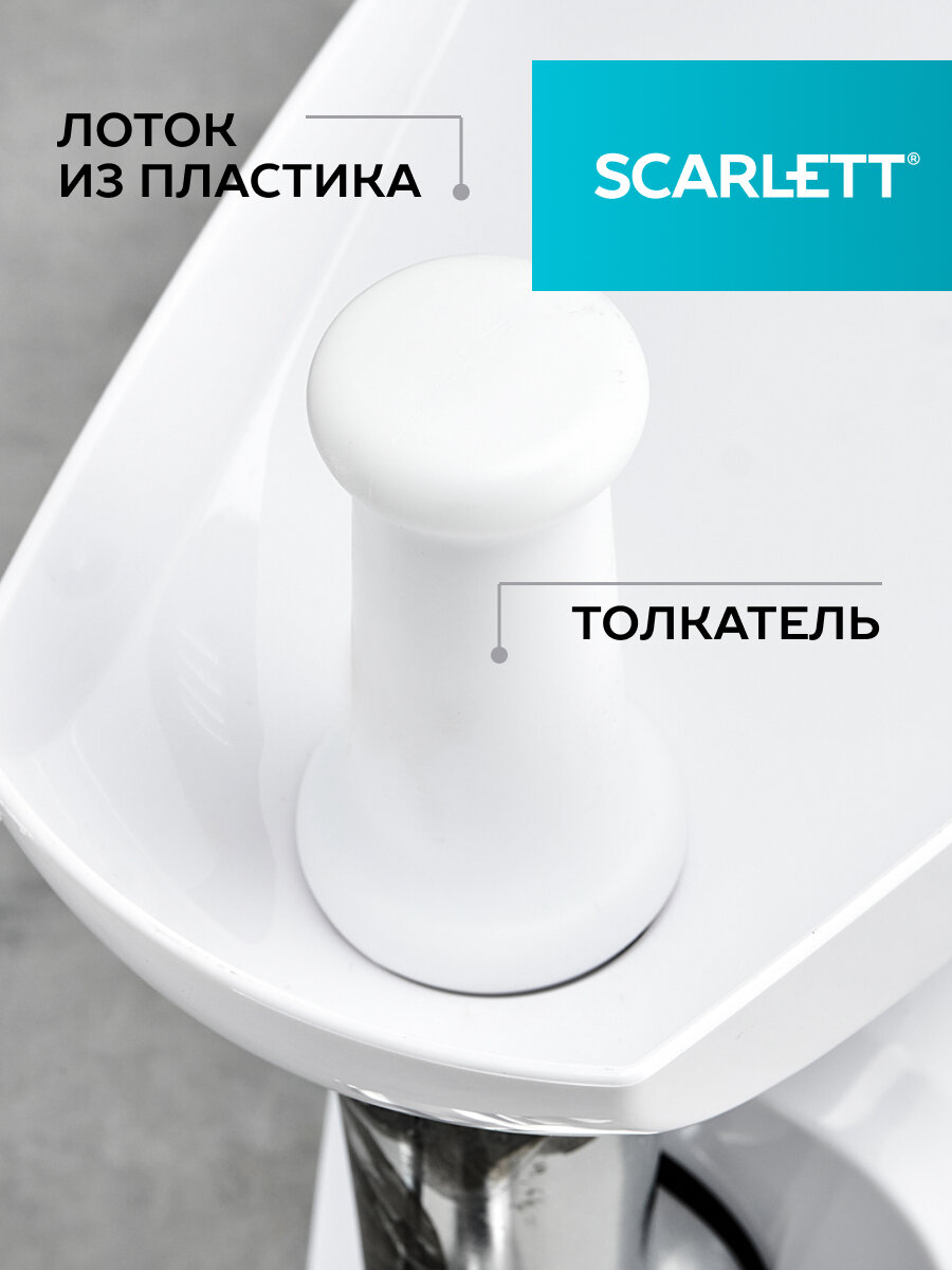 Мясорубка SCARLETT SC-MG45M20, 1800 Вт, производительность 2 кг/мин, 4 насадки, реверс, пластик, белая
