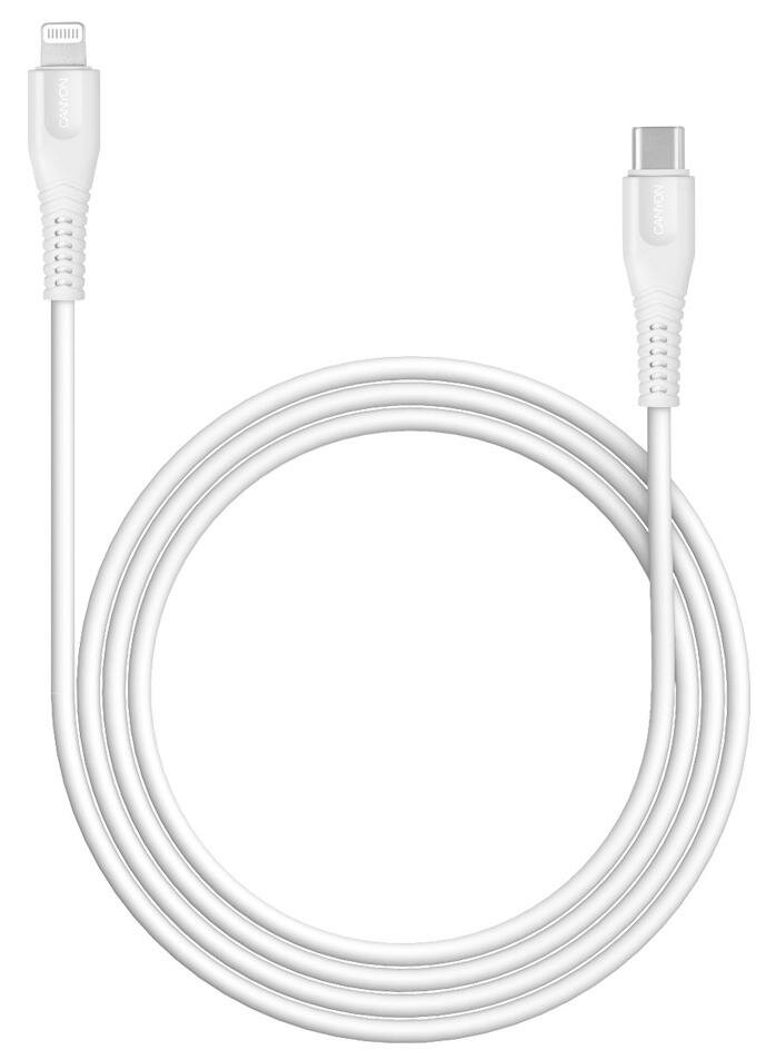 Кабель для зарядки CANYON и передачи данных USB Type-C - Lightning (лицензия Apple), MFI-4, 1.м., 3.5 мм. 5V/2.4A., PD 18Вт, белый