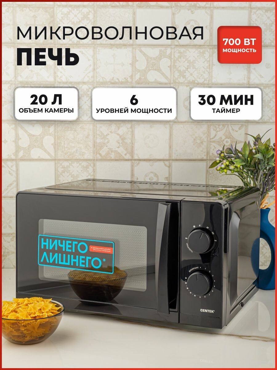 СВЧ Centek CT-1571 (Черный) 700W <20л> открывание дверцы ручкой, премиальная упаковка, таймер 30 мин