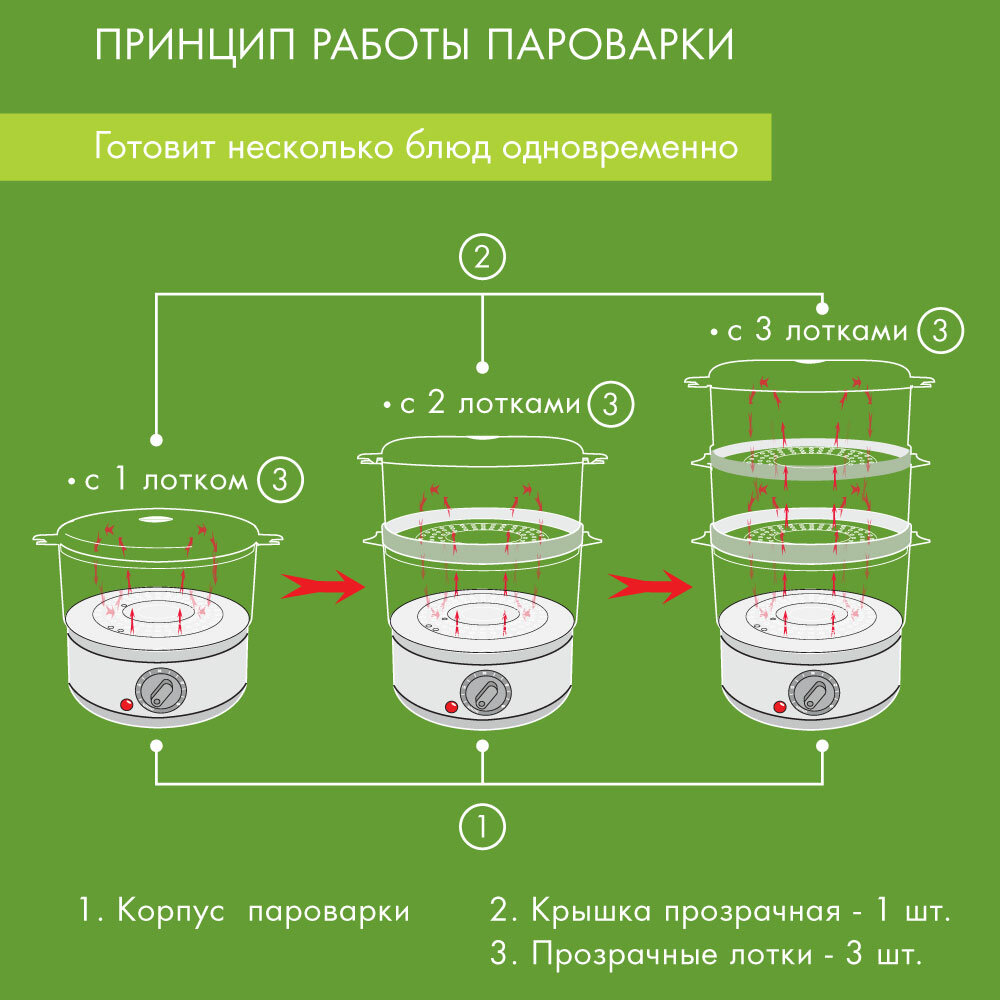 | Материал паровых корзин | прозрачный пластик |