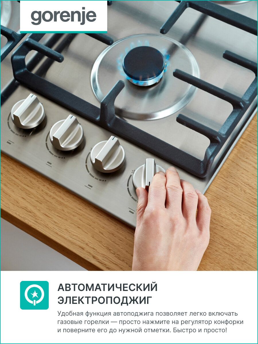 Газовая варочная поверхность Gorenje GW641EX, электроподжиг, чугунные решетки, конфорка Вок, нержавеющая сталь