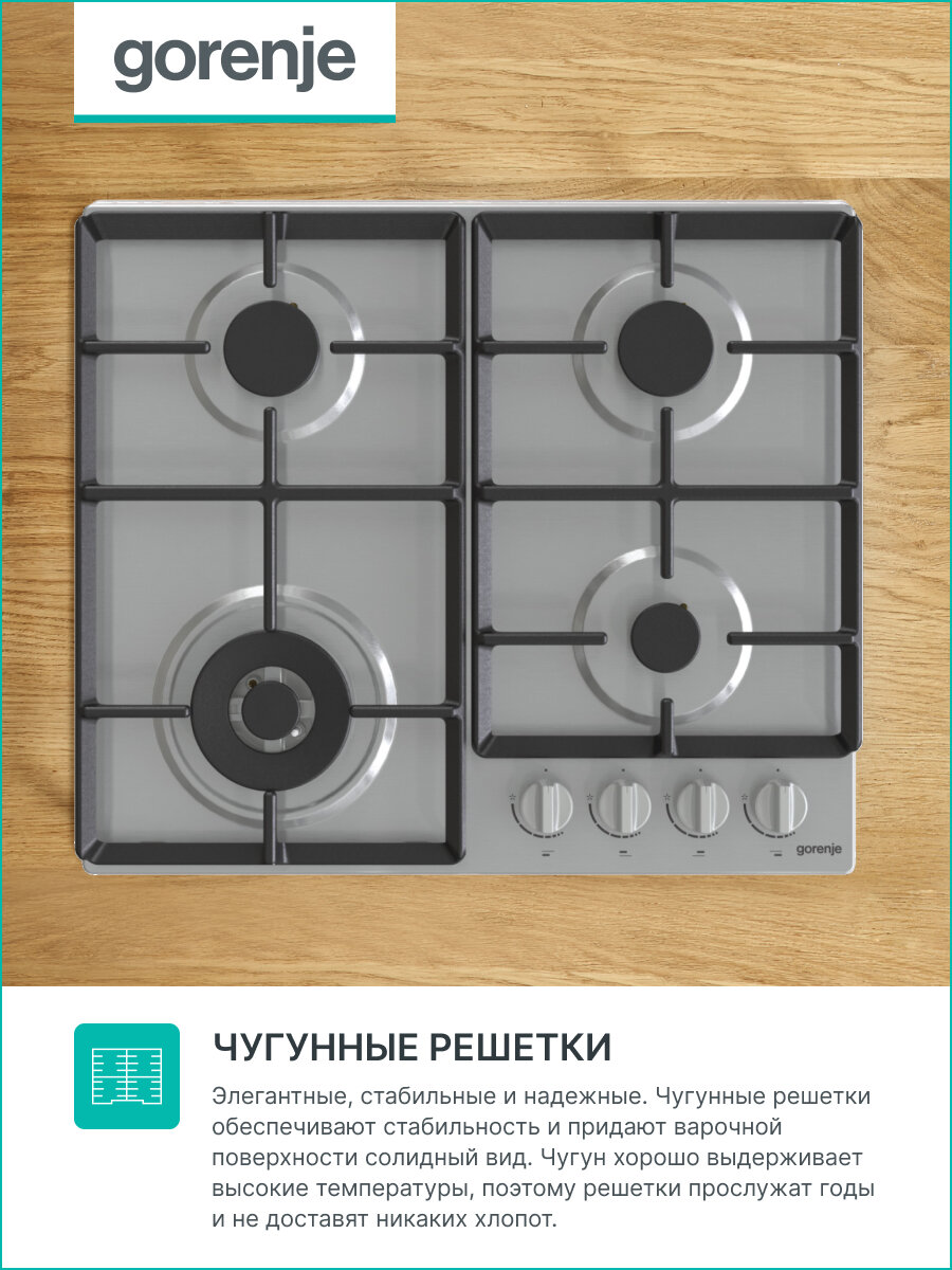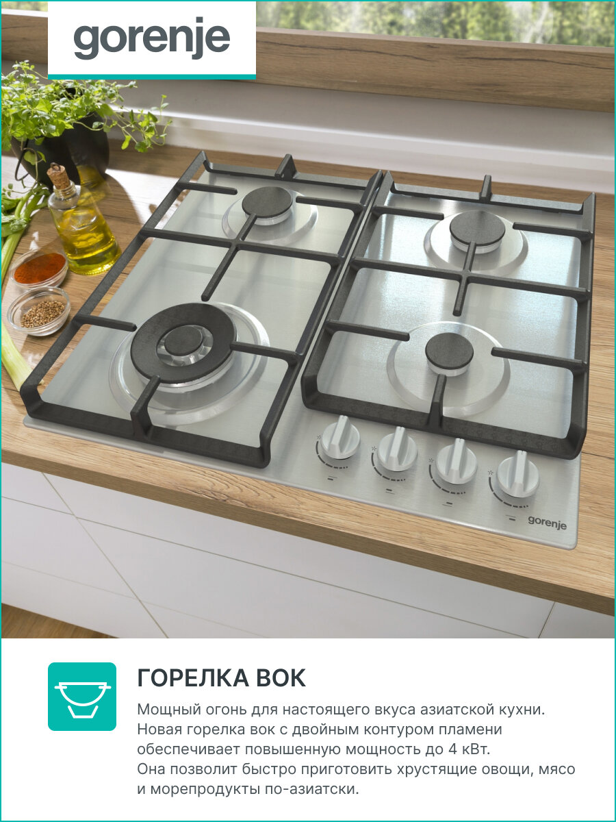 Встраиваемые газовая панели GORENJE/ Газ, 60 ? 13 ? 52 см, Газ-контроль, автоподжиг, чугунные решетки, WOK, нержавеющая сталь