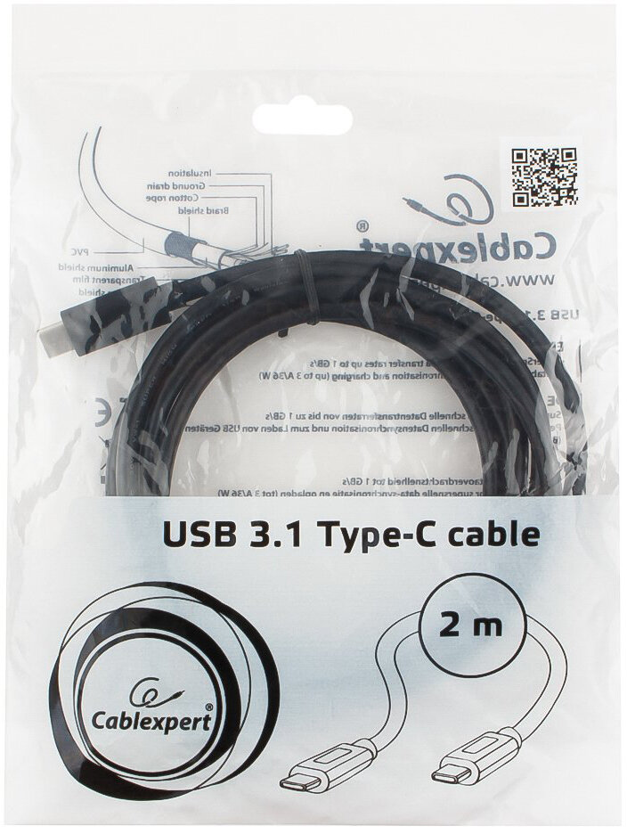 Кабель type Cшт - type Сшт. Cablexpert, USB3.1 Type-C/USB3.1 Type-C, 2м, пакет