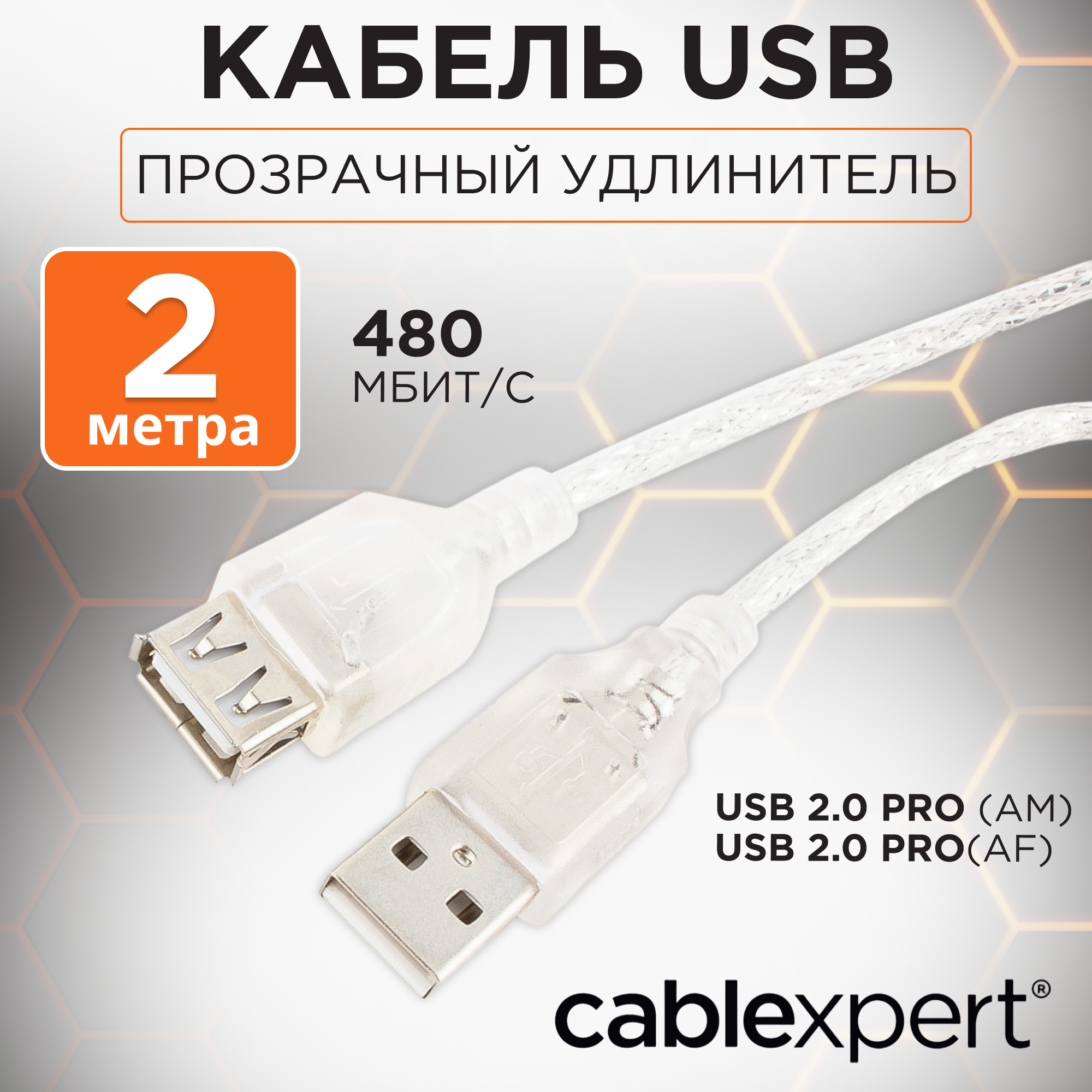 Кабель удлинительный USB 2.0 AM/AF 2 м Pro 2ферит. кольца, экран, прозрачный CCF-USB2-AMAF-TR-2M Cablexpert