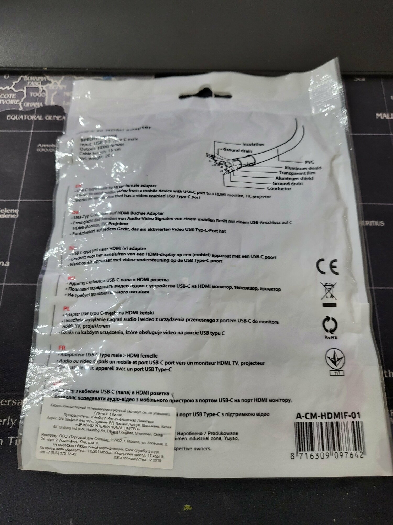 | Разъемы кабеля | HDMI (f) - USB 3.1 Type-C (m) |