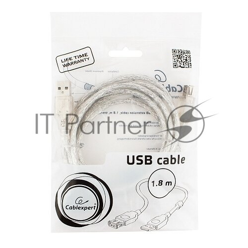 Удлинитель USB2.0 Am-Af Cablexpert CCF-USB2-AMAF-TR-6 Pro, экран, феррит - кабель 1.8 метра, прозрачный