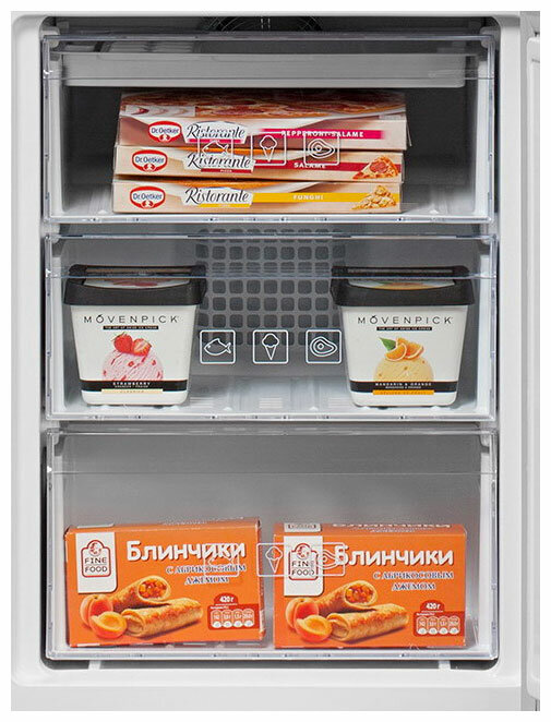 В комплектации: зона свежести с цветной подсветкой, для сохранения свежести фруктов. Подставка для яиц, перевертыш в подставку для бутылок. И бестолковый поддон в нижний ящик морозилки с вкладышем под лёд. За свой прайс оптимален, если выставить по уровню и допилить вопрос с креплением (шумами) получится маст хэв. |
