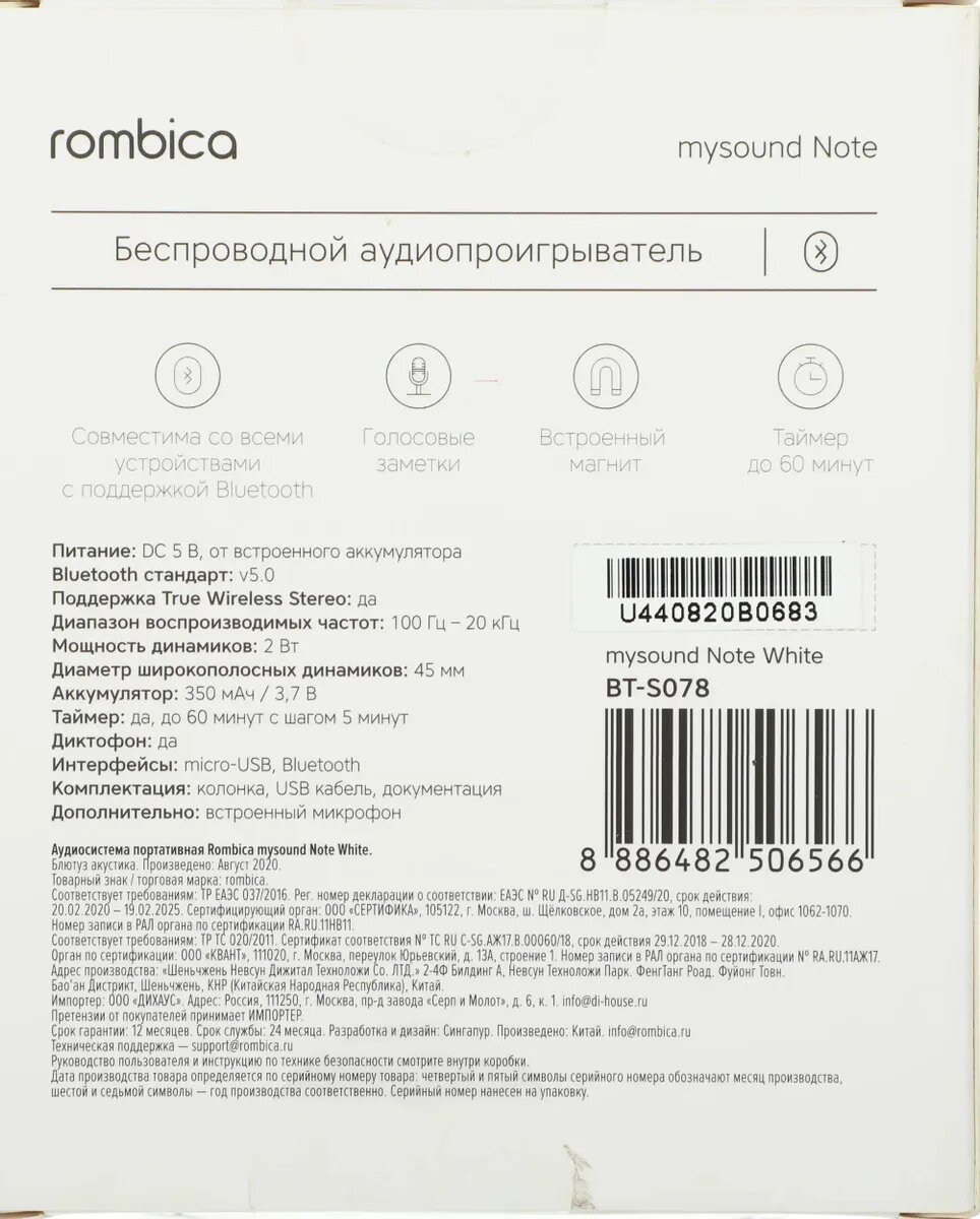 Портативная колонка ROMBICA Mysound Note, 2Вт, белый [bt-s078]
