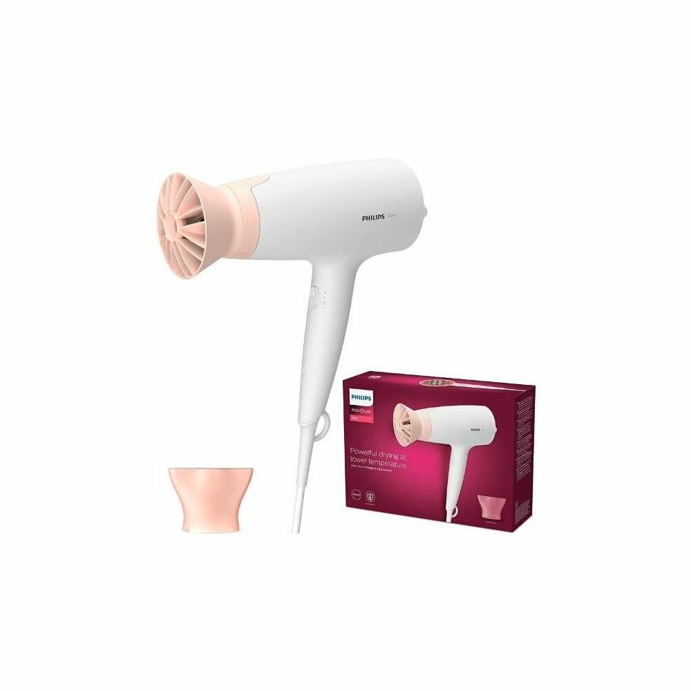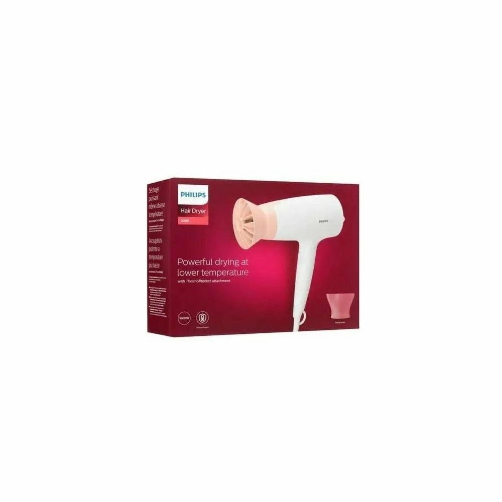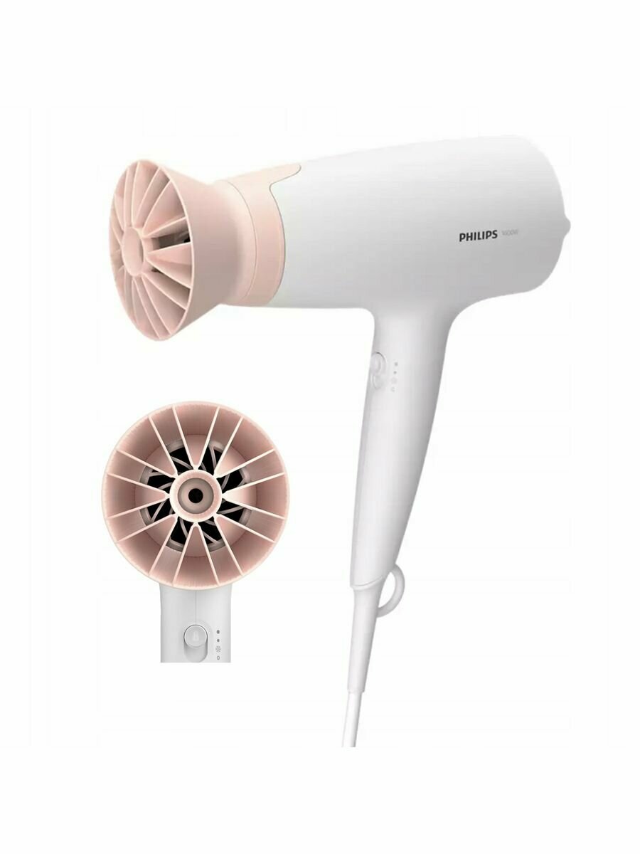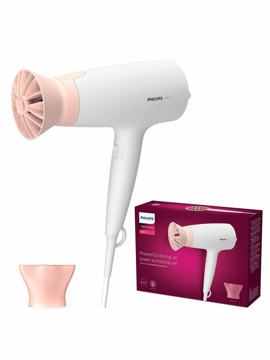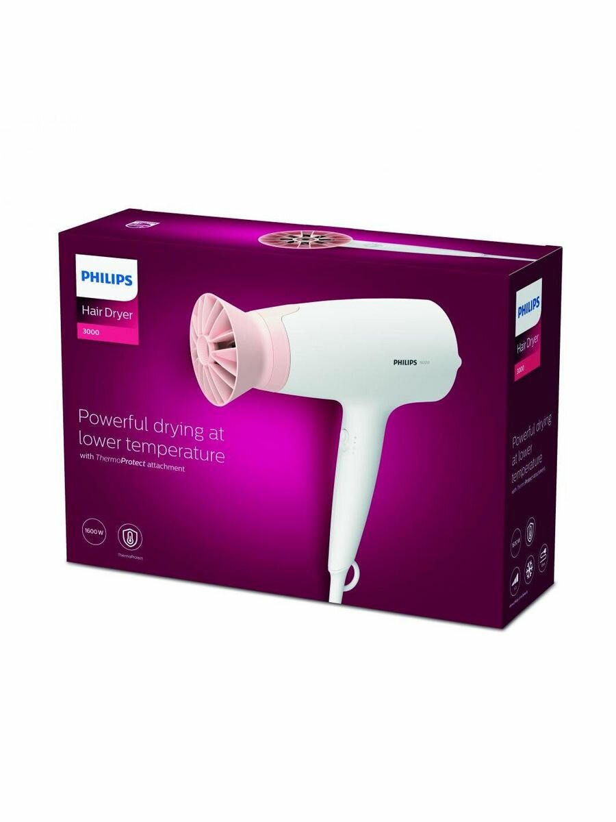 Фен для волос Philips Series 3000 BHD300/00, 1600 Вт, насадка ThermoProtect, концентратор 14 мм, холодный обдув, белый/розовый
