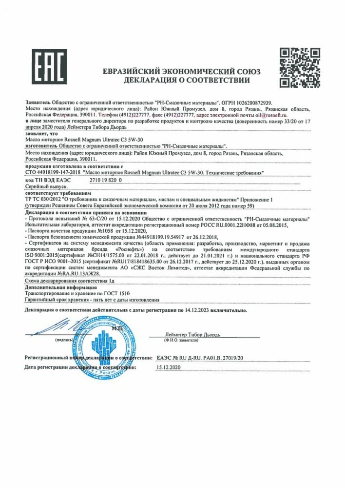 Rosneft Rn Magnum Ultratec 5/30 C3 (1л) Рнпк