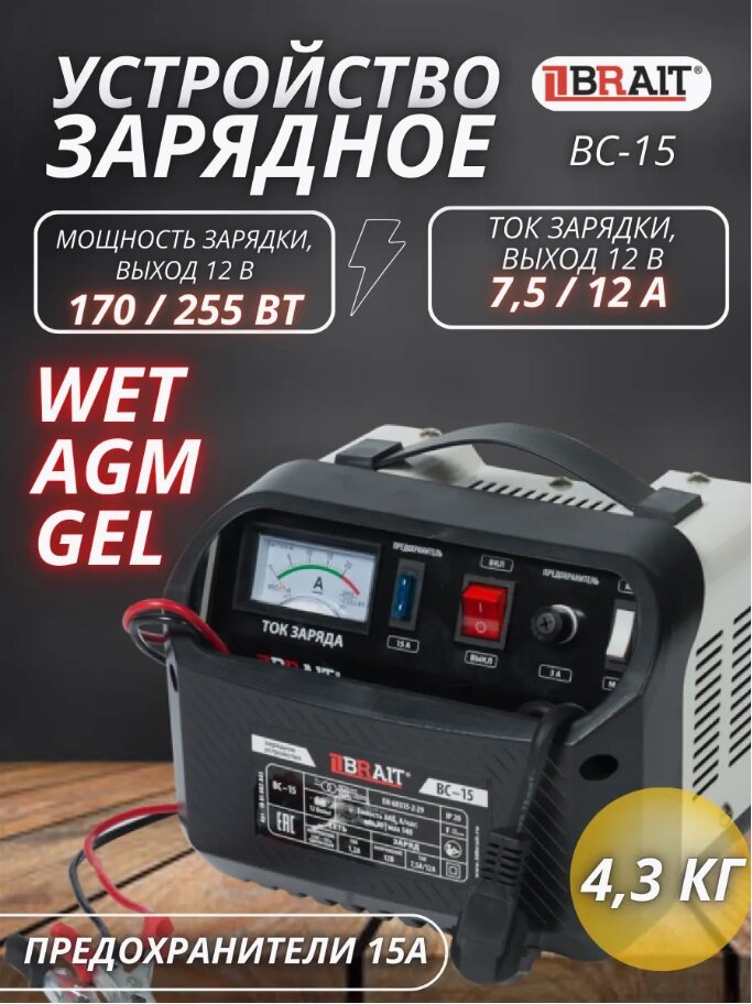 BRAIT Устройство зарядное BC-15 (Напряжение 12/24В, 170/330Вт,емкость 18-120А/ч,сеть 220В-50Гц,ток 8, шт BRAIT