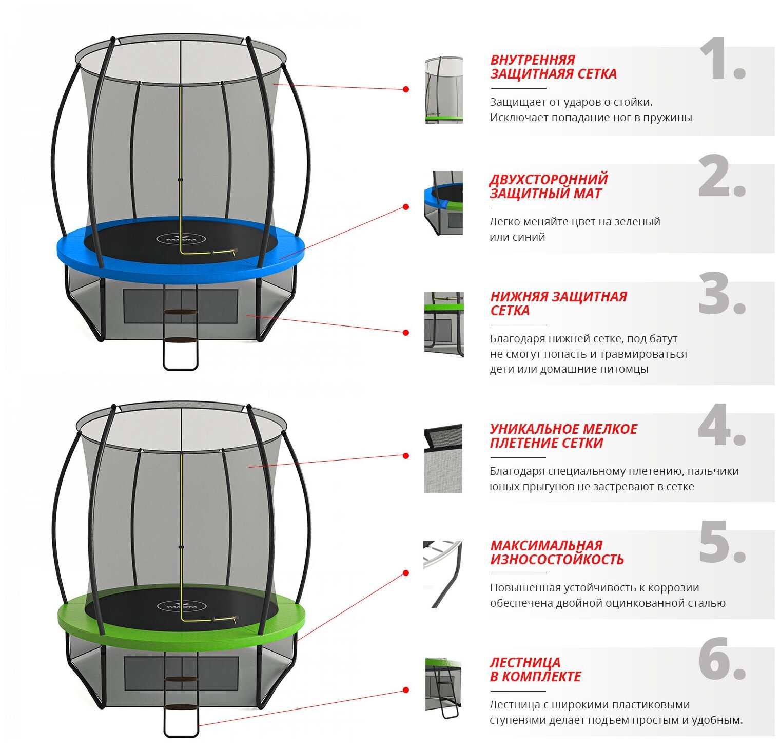 | Плюсы: | Оптимальный вариант по диаметру - 2,44 метра, нагрузке - до 150 кг, высоте сетки - около 180 см. Конструкция батута прочная, устойчивая. Важно, что крепления сетки находятся на удалении от нее - такой вариант менее травмоопасный. Батут легко выдерживает взрослого и ребенка (суммарно 110 кг) |