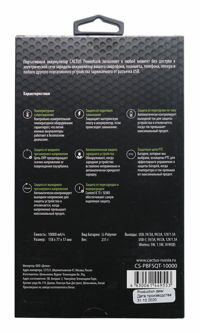 Мобильный аккумулятор Cactus CS-PBFSQT-10000 .