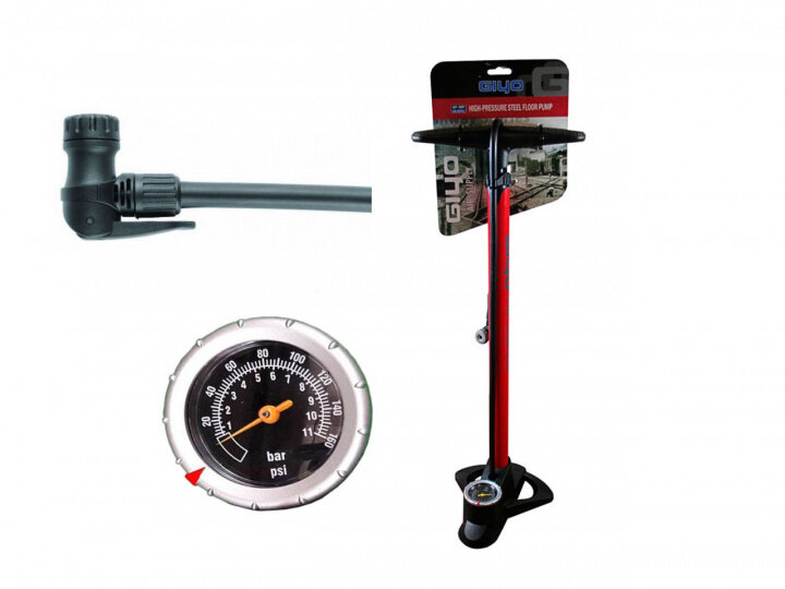 Купить Насос для велосипеда GIYO GF38P напольный стальной, 11 атм/160psi, большой манометр, “авто/вело” ниппель, цвет: красный