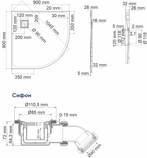 Душевой поддон из стеклопластика WasserKRAFT Main 90x90 41T01 с сифоном и трапом