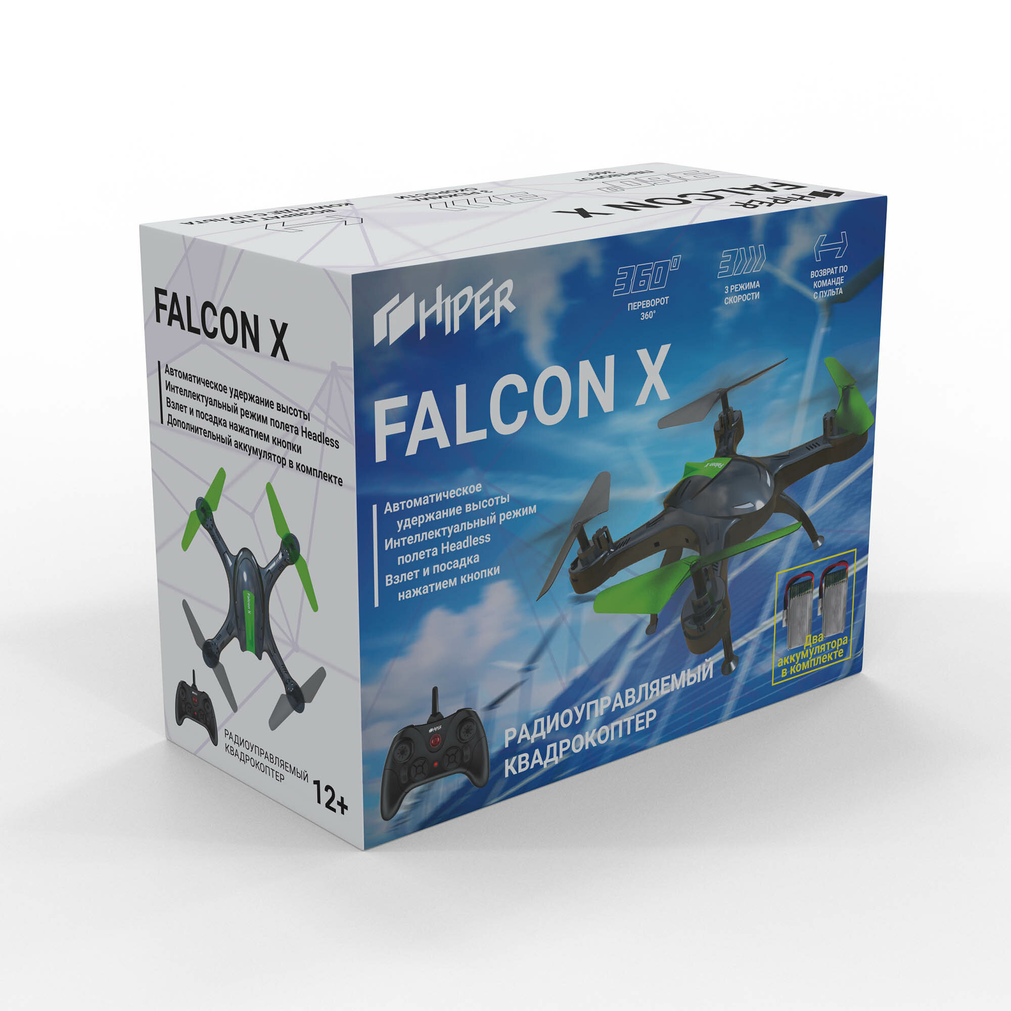 Радиоуправляемый квадрокоптер HIPER HQT-0002 FALCON X, два аккумулятора, автоматическое удержание высоты, система стабилизации, 3 режима скорости, кульбиты, режим headless, черный/зеленый