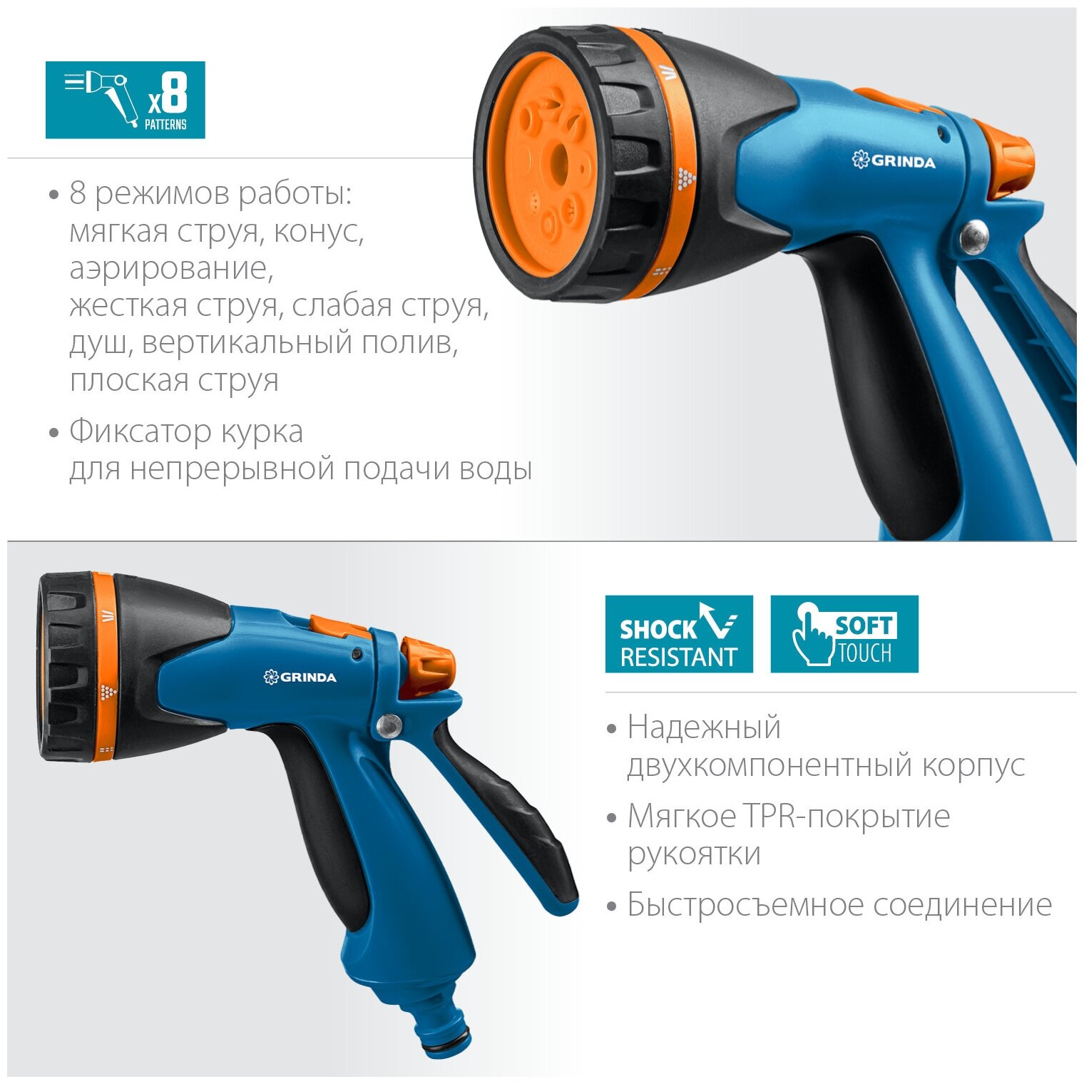 GRINDA PROLine B-8, 8 режимов, курок сзади, пистолет поливочный двухкомпонентный