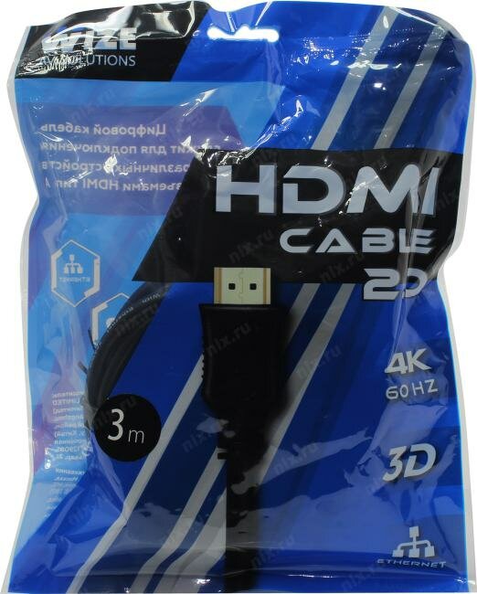 Кабель Wize HDMI 3 м, v.2.0, 19M/19M, позол.разъемы, экран, черный, пакет