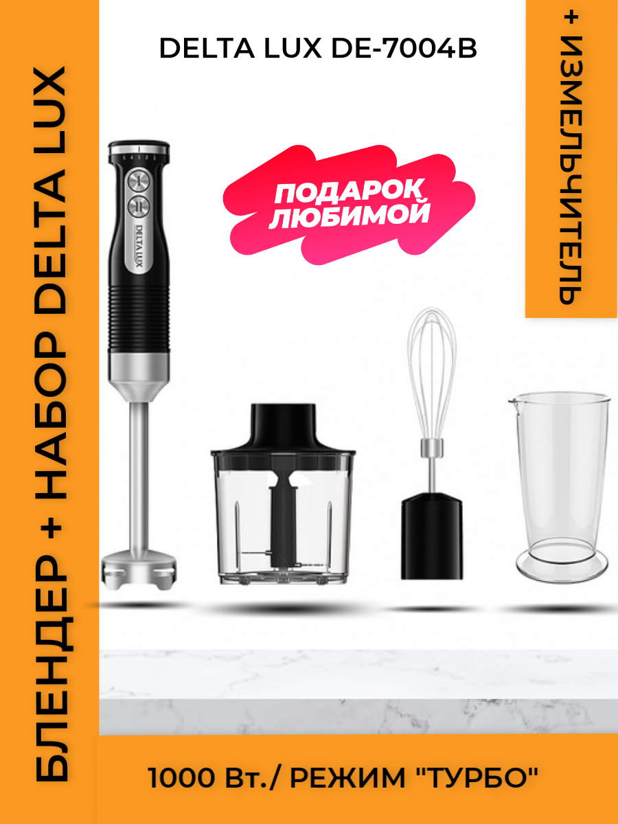СохранитьБлендер DELTA LUX DE-7004B черный: 1000Вт регулир. скорости,"Турбо",стакан, венчик, измельчитель(6) интересное: