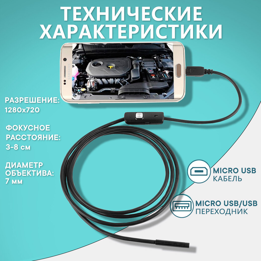 Купить Эндоскоп для смартфона Андроид и компьютера водонепроницаемый InnoZone 720P 7мм гибкая камера, подсветка, длина 1м, для автомобиля и бытовых нужд