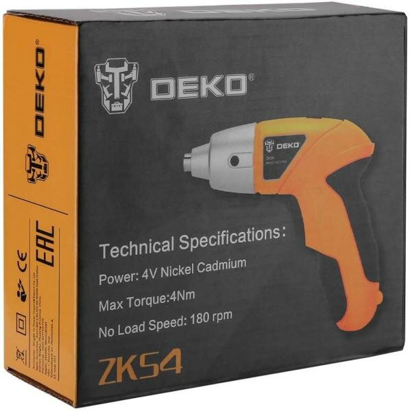 Deko Аккумуляторная отвертка Zks4, 4В, 0.6 Ач, з/у с набором оснастки 10 шт, 4 Нм063-4113