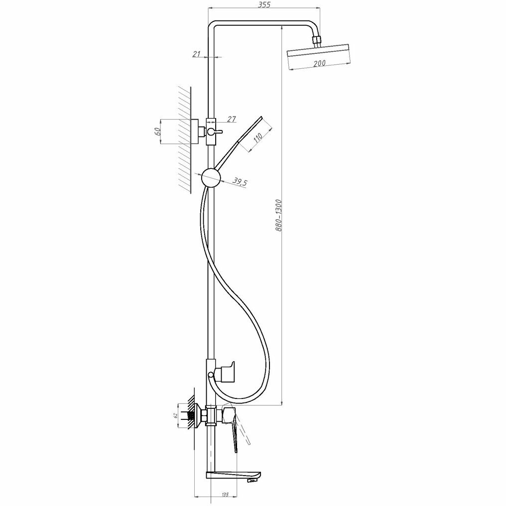 | Дополнительная информация | встроенный картридж имеет диаметр 35 мм; высота 880-1300 мм; ширина трубки 21 мм; диаметр лейки стационарной трубки 200 мм; диаметр лейки на гибком шланге 110 мм; расстояние от стены до рычага 135 мм |