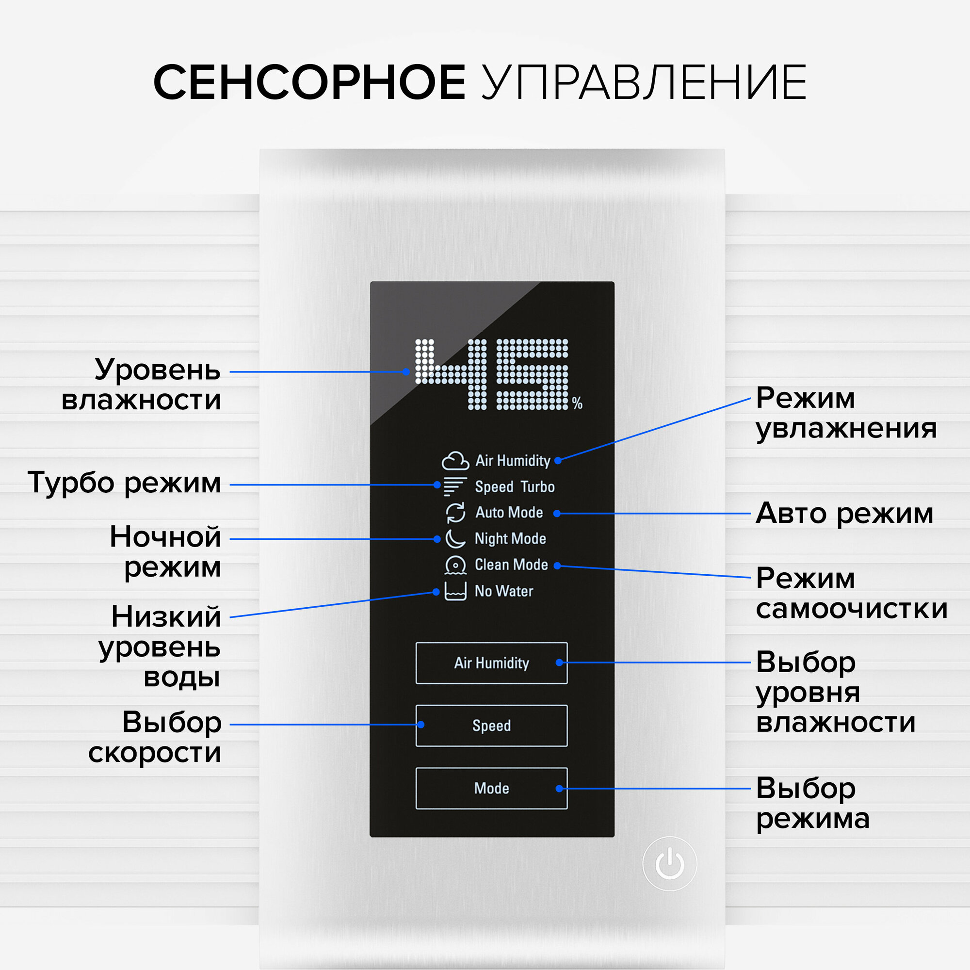 И внешний вид, и режимы работы. Ночью низкая яркость дисплея, совсем тихо. Днем можно задавать скорость (обычно 3, ибо на 4 шумновато). Можно и желаемую влажность задать, но не вижу особого смысла. Понятно, что он около себя измеряет, а не там, где внешний измеритель стоит. Либо "повыше" указать, с запасом. |