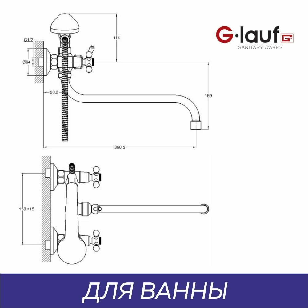 Смеситель для ванны с душем двухвентильный, кран в ванную G.lauf QFR7-C722, хром