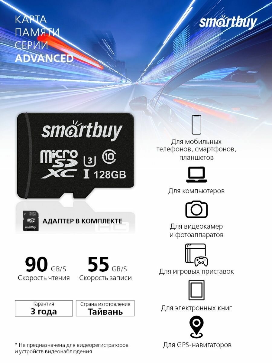 Карта памяти SmartBuy MicroSDXC 128GB PRO U3 Advanced, Class 10, скорость чтения 90Мб/сек (с адаптером SD)