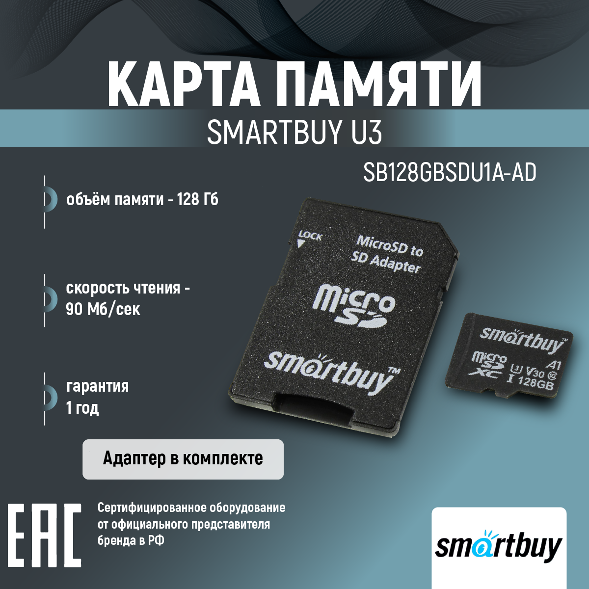 smartbuy (sb128gbsdcl10-01) microsdxc 128gb class10 uhs-i u1 + адаптер карта памяти