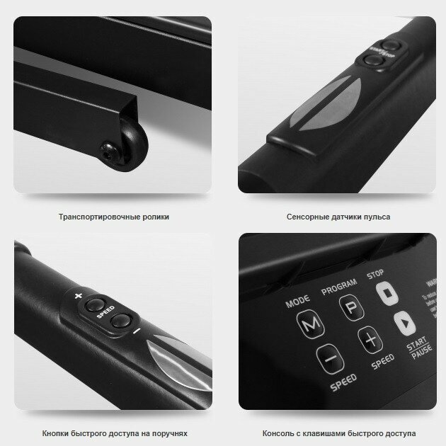 Качество Сборка Выбор программ, высоты дорожки, скорости Пульсометр, счетчик калорий |