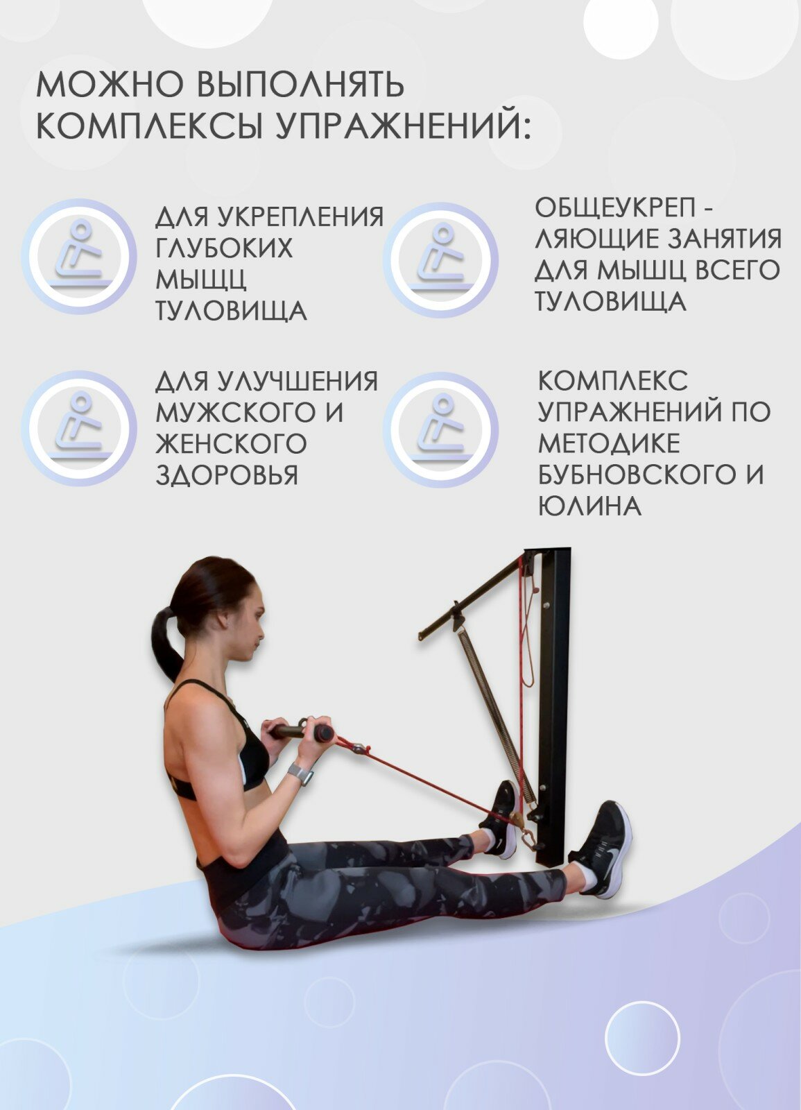легко сложить, разложить есть возможность регулировки под рост большой спектр упражнений для спины, шеи, ног, груди |