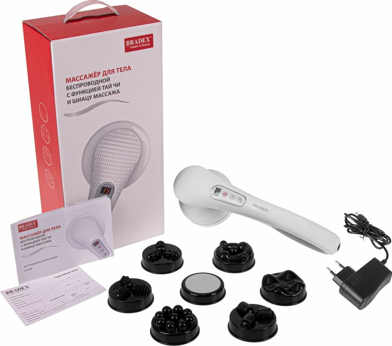 Массажер для тела беспроводной BRADEX KZ 0568 8 насадок, черный/белый