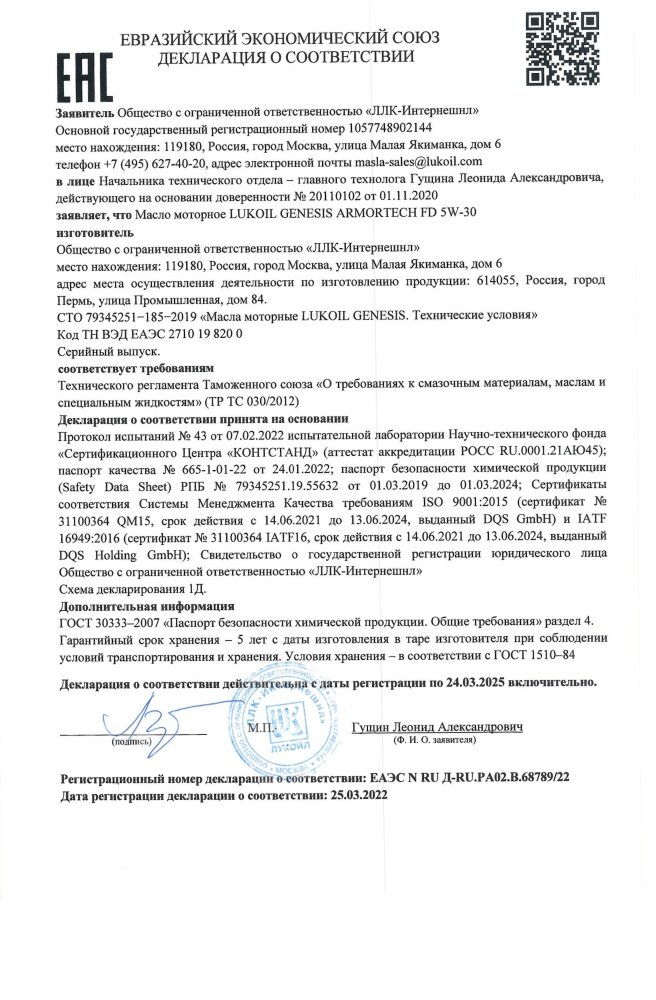 Масло Лукойл Genesis Armortech 5w-30 FD A5/B5 (4л) синт.