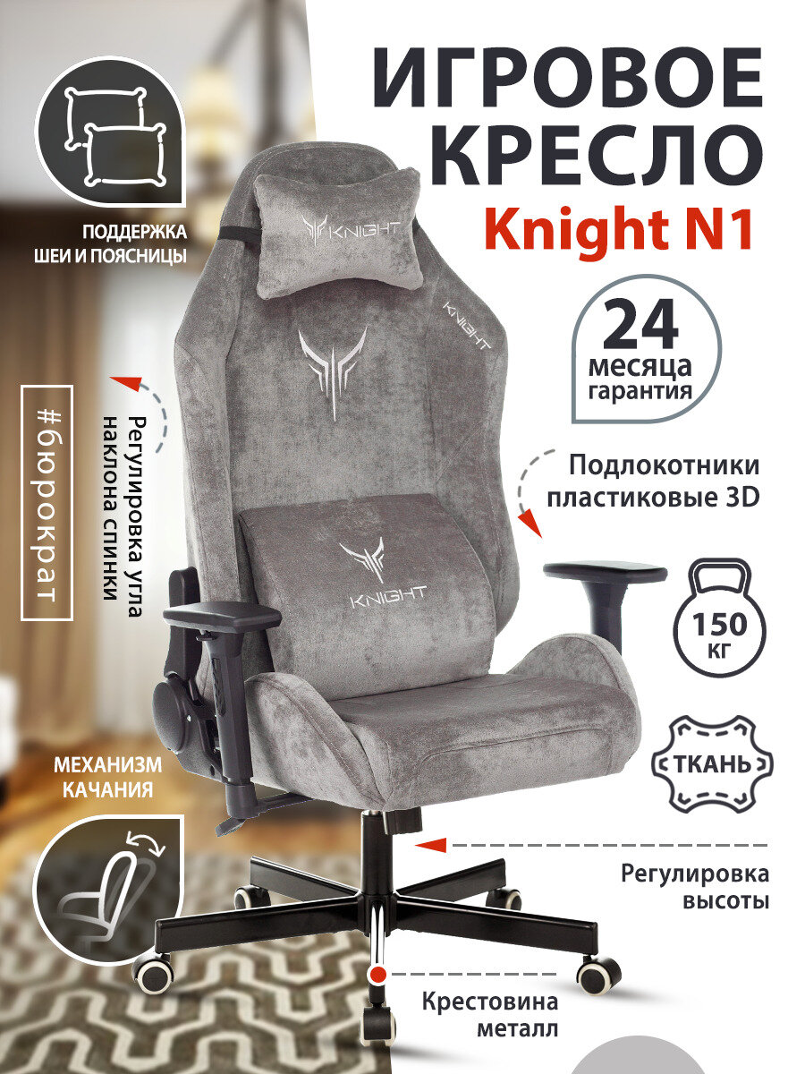 Кресло игровое Knight N1 Fabric серый, ткань / Компьютерное геймерское кресло, 2 подушки, крестовина металл