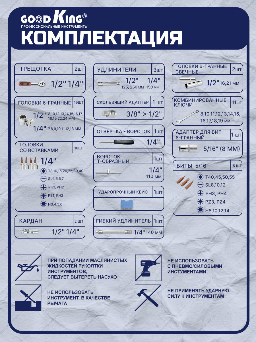СохранитьB-10078 Набор инструментов для авто 78 предметов 1/4 1/2 трещотка 72 зуба Goodking B-10078 . интересное: