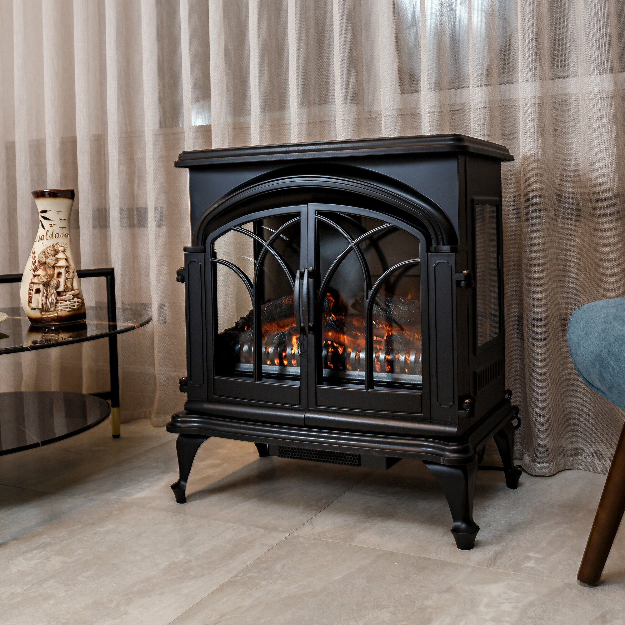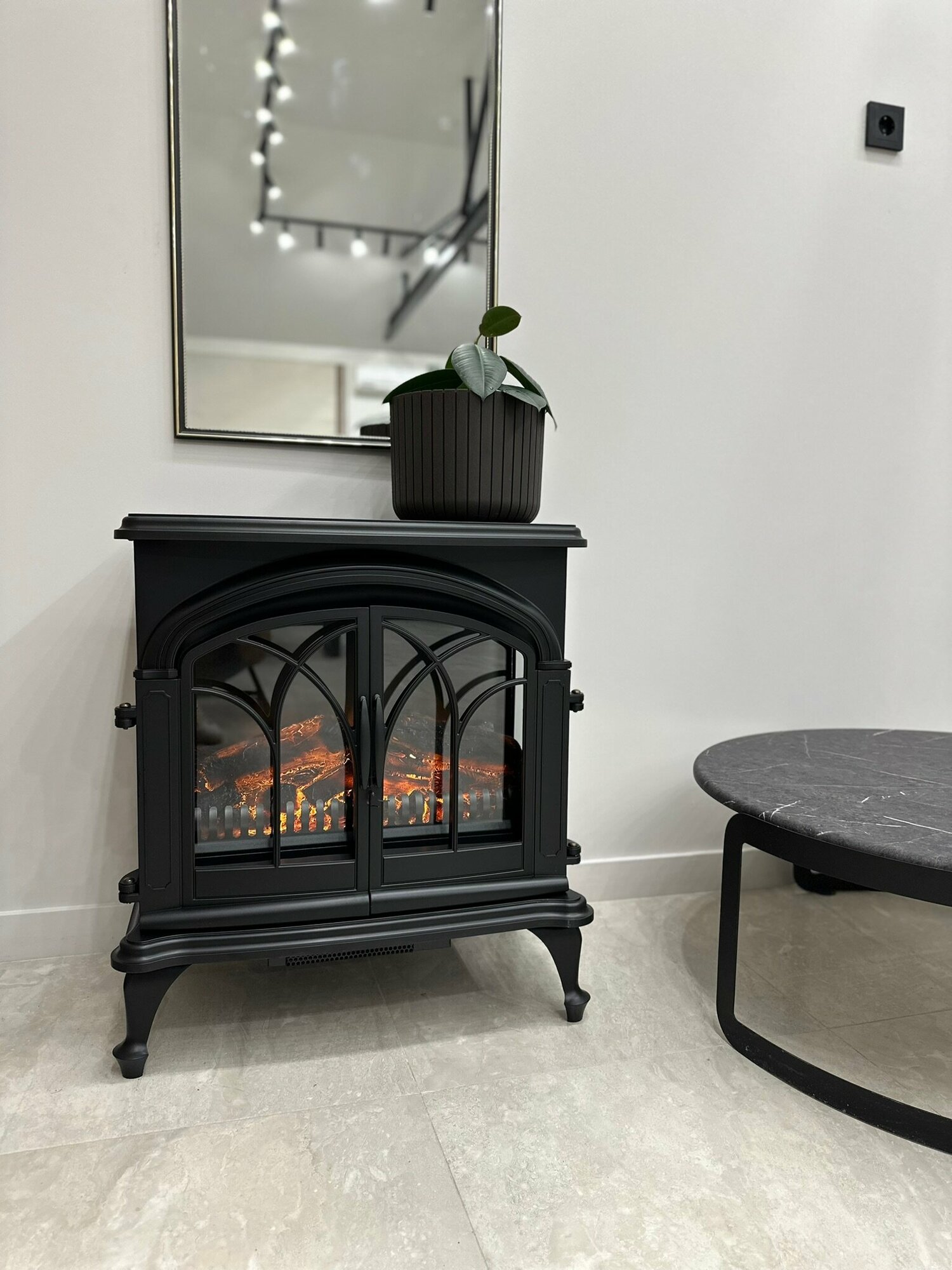 | Плюсы: | Красиво вписался в интерьер. Смотрится как настоящий дровяной камин. Отапливает гостиную размером 60 м. |