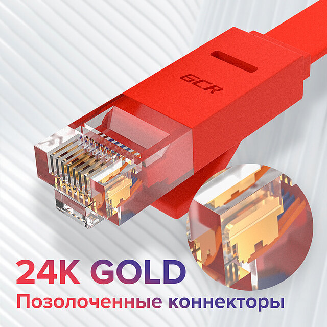Патч-корд GCR PROF плоский UTP cat.6 10 Гбит/с RJ45 LAN кабель для интернета контакты 24K GOLD (GCR-LNC62) красный 1.0м
