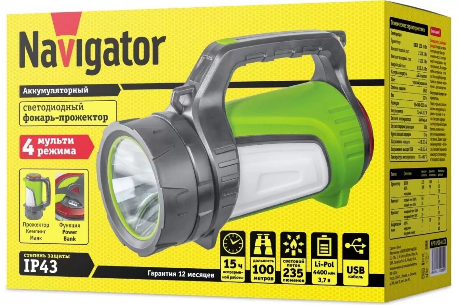Фонарь Navigator NPT-SP20-ACCU, прожектор/кемпинговый, 1CREE+12+12+9LED, аккумулятор 3.7В, 4.4Ач 14160