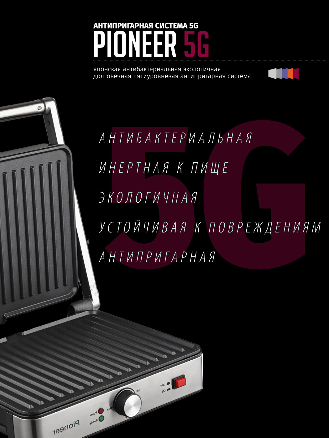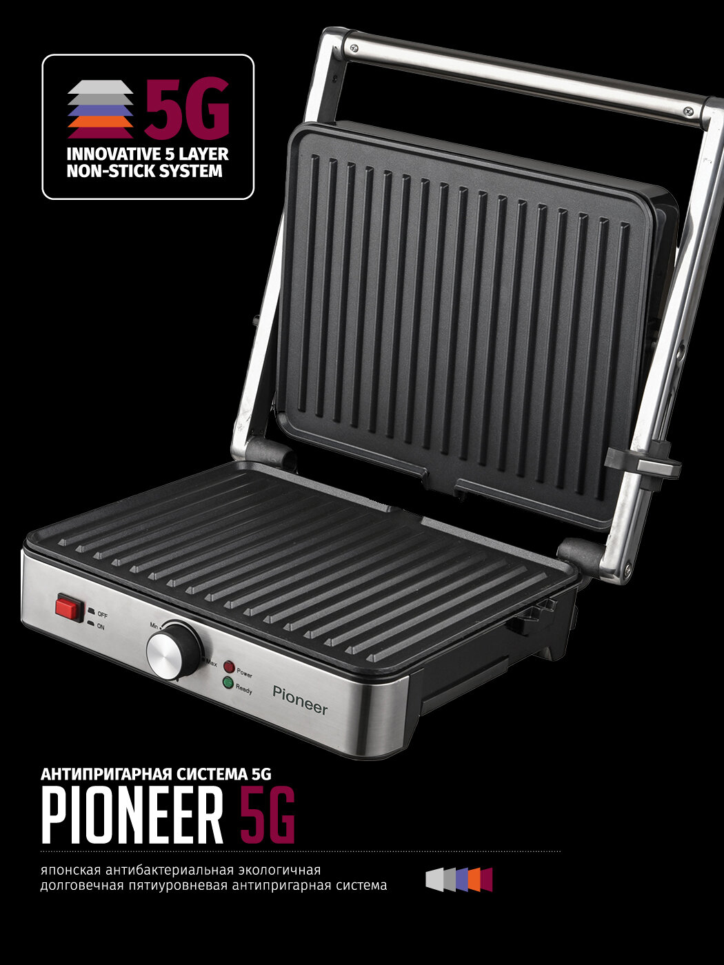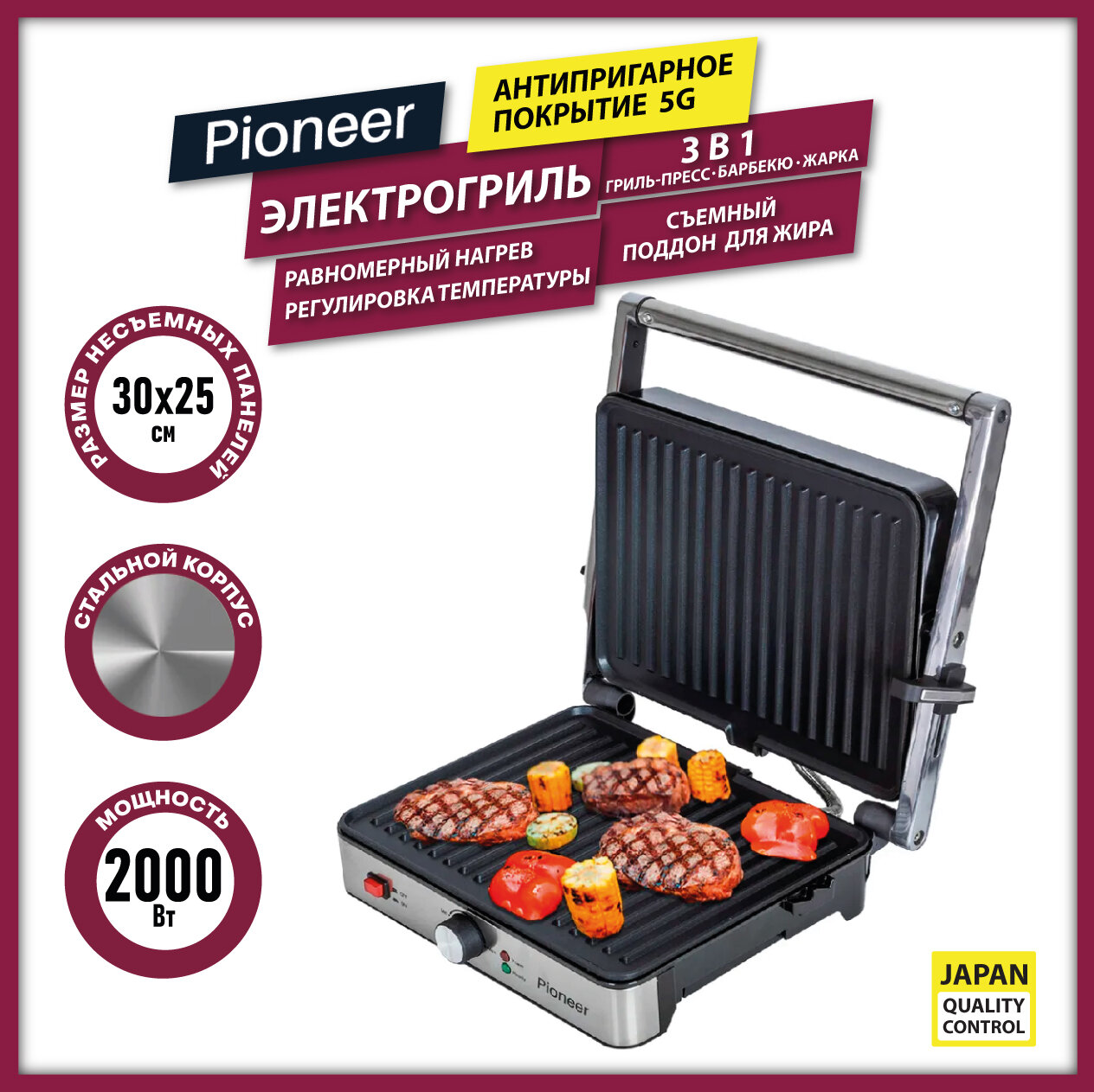 Гриль электрический для дома Pioneer с антипригарными панелями, режимы гриль-пресс+ барбекю+жарка, регулировка температуры, антипригарная система 5G, 2000 Вт
