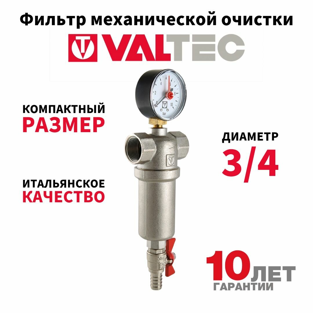 Фильтр промывной 3/4" каскадный механической очистки с манометром и дренажным краном, Valtec(VT.389.N.05)