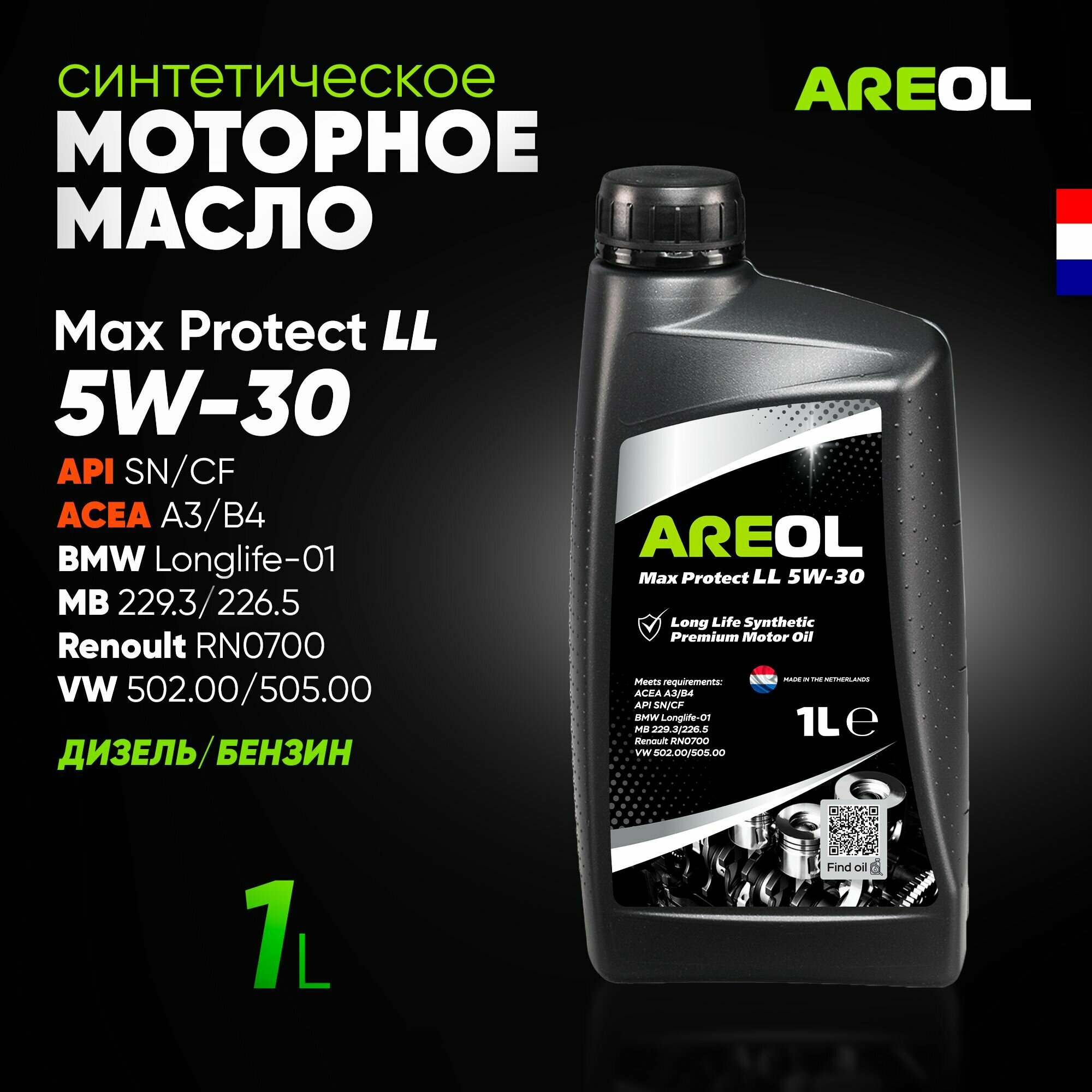 AREOL Max Protect LL 5W-30 (1L)_масло моторное! синт.\ ACEA A3/B4, API SN/CF, MB 229.3/226.5 5W30AR012