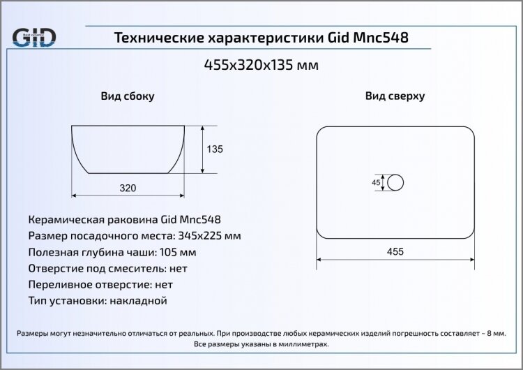 Накладная раковина для ванной Gid Mnc548 с донным клапаном