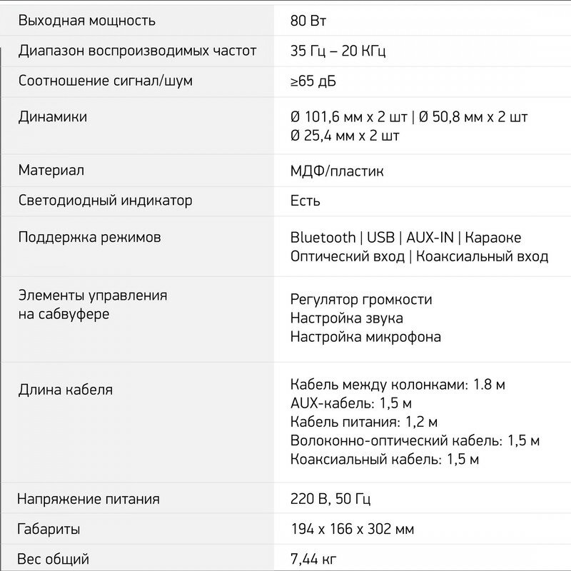 | Минусы: | Мощность 80 Вт – обман. На деле она не превышает 5-7 Вт. Что делает колонки непригодными к планируемой эксплуатации. |