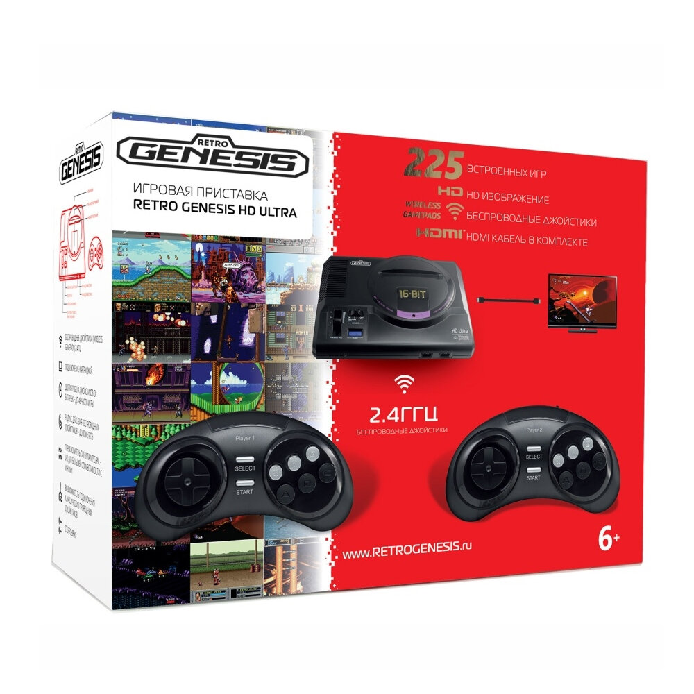 Игровая консоль RETRO GENESIS 225 игр, два беспроводных джойстика, SEGA Retro Genesis HD Ultra, чер