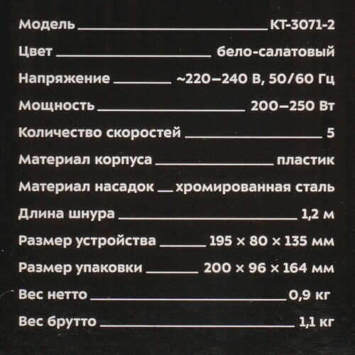 Миксер КТ-3071-2 ручной электрический, 5 скоростей, 4 насадки, мощность 250 Вт, белый/зеленый